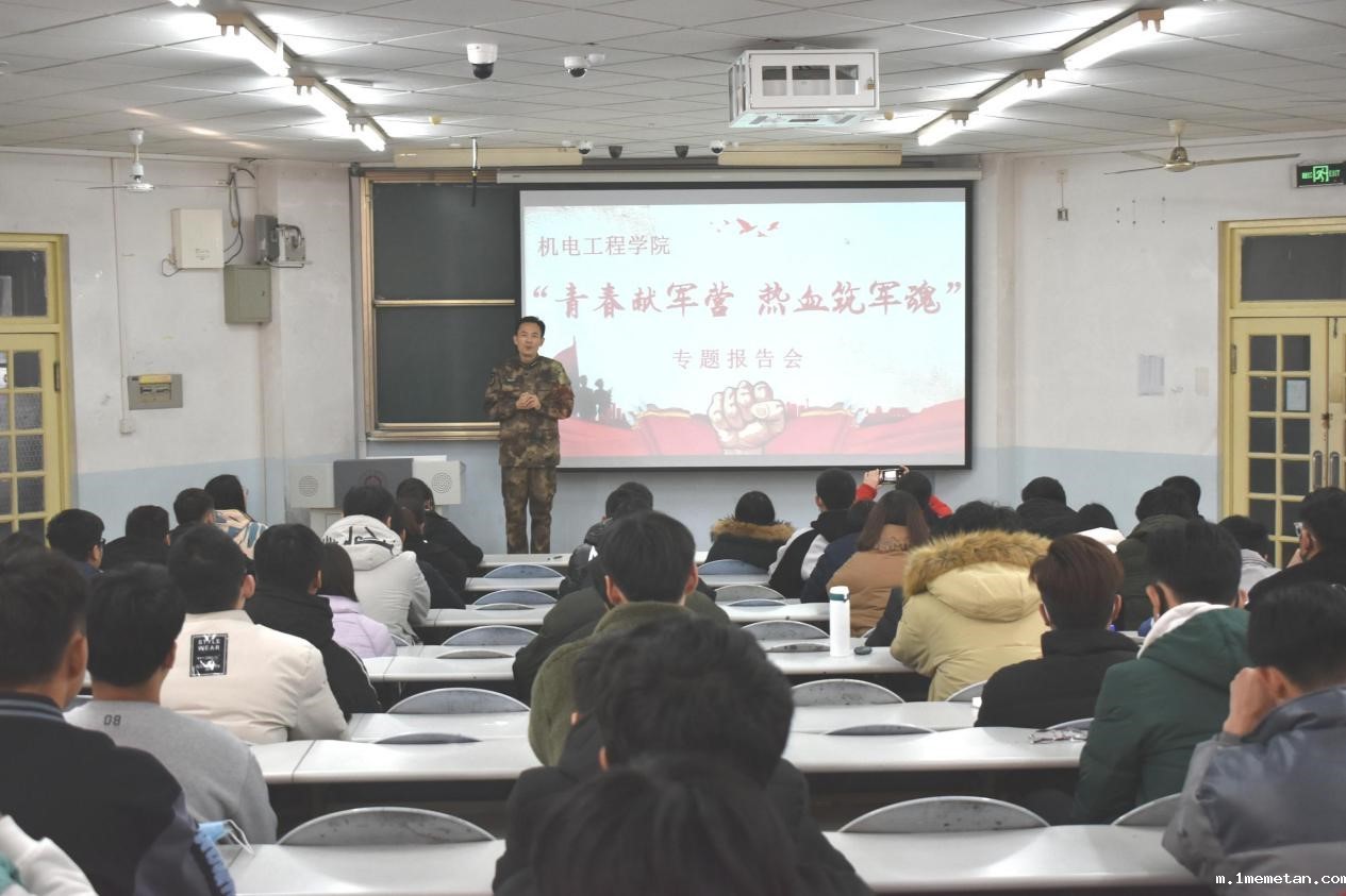 为全面落实学校征兵工作的有关通知精神,使青年学生不断增强国防意识,激发爱国主义情怀,12月24日,机电工程学院“青春献军营,热血铸军魂”专题报告会在博文楼举行。本次报告会邀请我校人民武装部副部长申钊同志主讲,机电工程学院辅导员和各班“征兵政策宣讲员”聆听了报告。